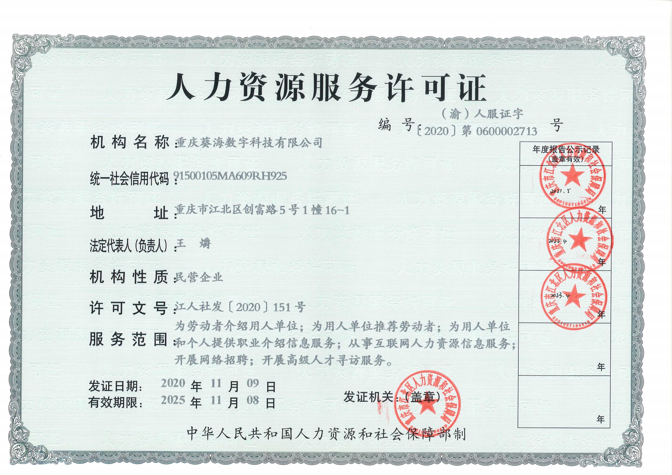 11月,入選重慶市人社局留學(xué)人員回國(guó)創(chuàng)業(yè)創(chuàng)新支持計(jì)劃 取得人力資源服務(wù)許可證;