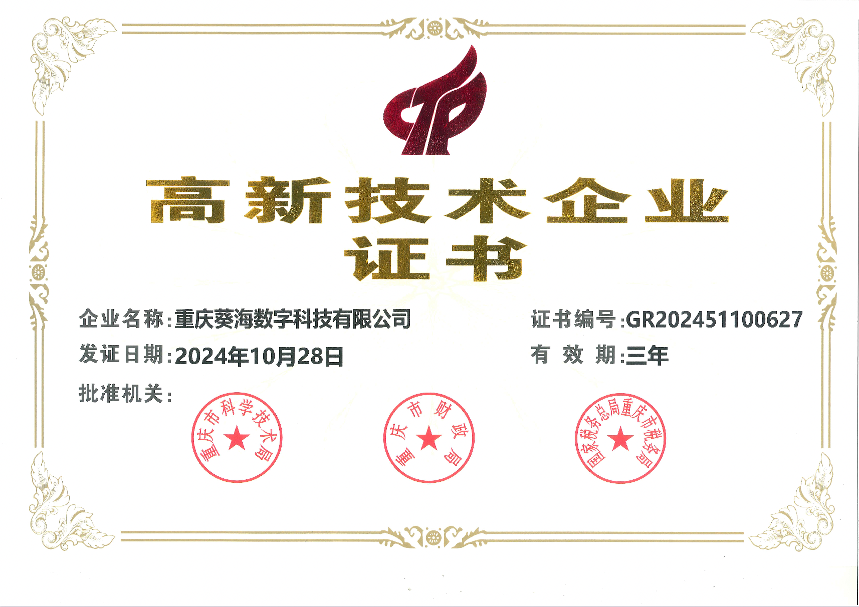 03月,重慶江北區(qū)政府引進(jìn) 重慶葵海數(shù)字科技有限公司注冊(cè)成立;